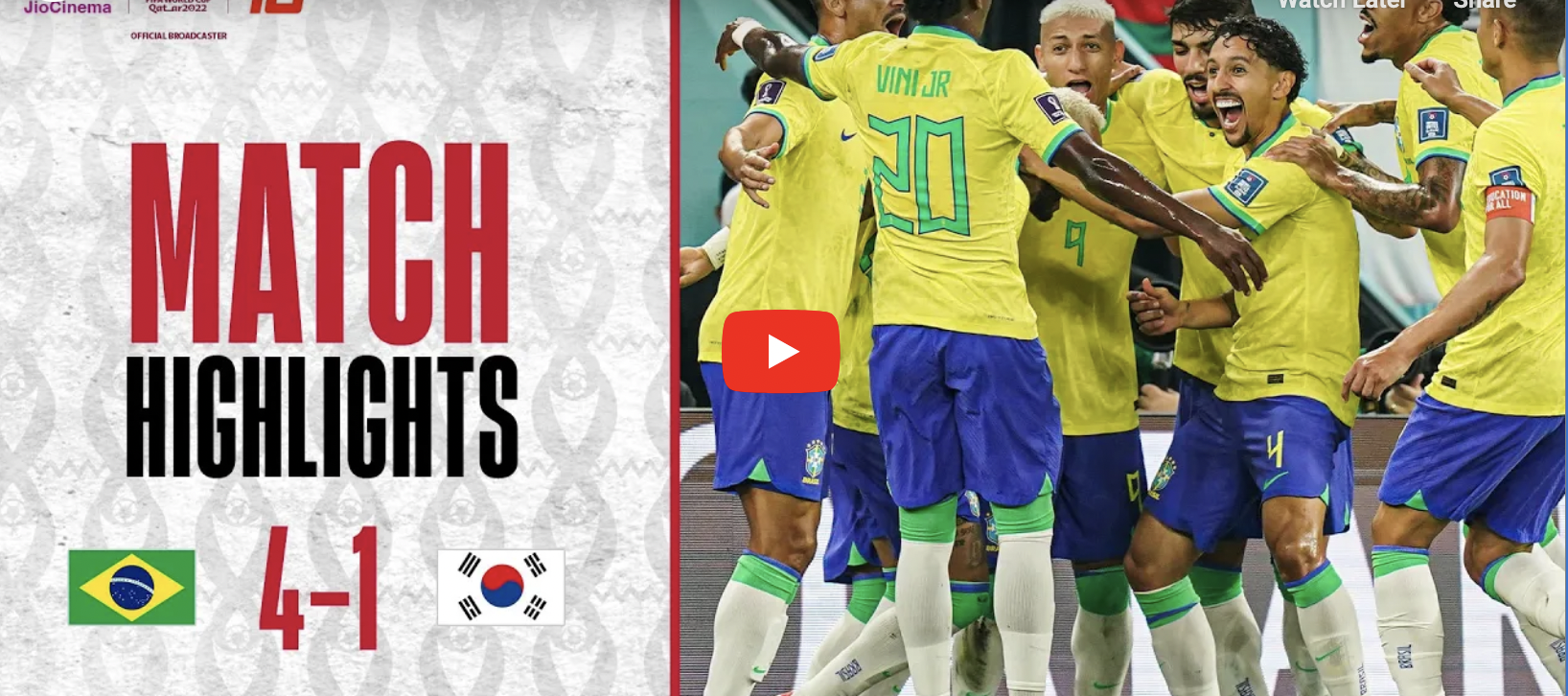 Web The 2022 FIFA World Cup continued Monday on FOX with Brazil dominating South Korea 4-1 at Stadium 974 in Ras Abu Aboud Qatar in the tournaments sixth match of the round of 16. Web Neymar scores brace as Brazil beat S. Web 10 hours agoThe Brazil-South Korea game starts on Monday Dec.